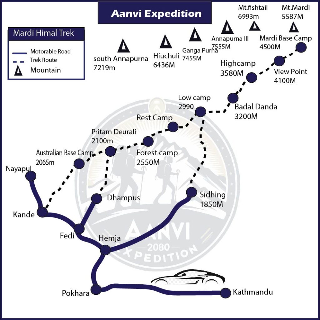 | Altitude of Pokhara: 822 m | Altitude of Pritam Deurali/ 2100mLovely Hill: 2250 m | Altitude Gain: 1428m |